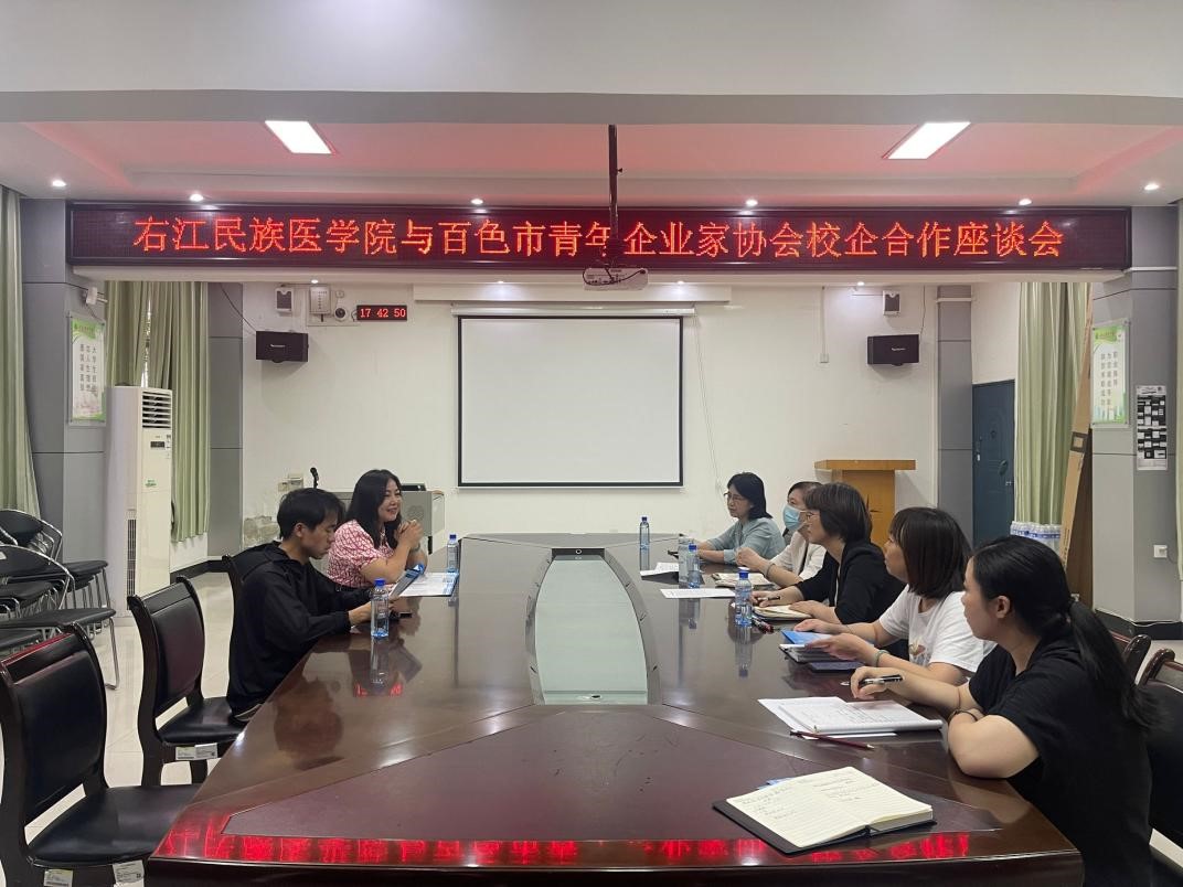 交流会上,百色市青年企业家协会、百色市文化旅游协会负责人对协会发展规模,业务范围和见习合作进行了基本介绍。陆小曲处长介绍鸭脖办学特色、学科专业设置和人才培养及就业创业情况。随后,双方围绕利用地缘优势,提供实习和就业岗位,进一步探索开展校企合作内容等工作展开交流。