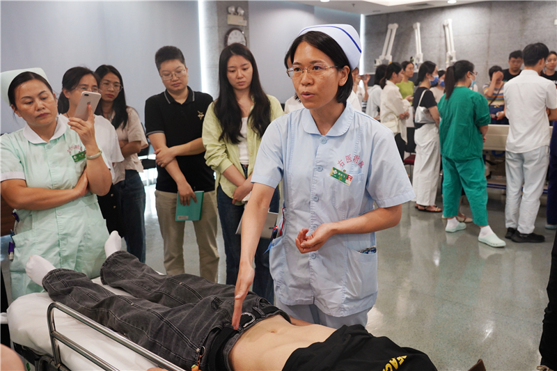 右医附院感染性疾病科覃凤飞护士长指导参会人员进行腹部的健康评估