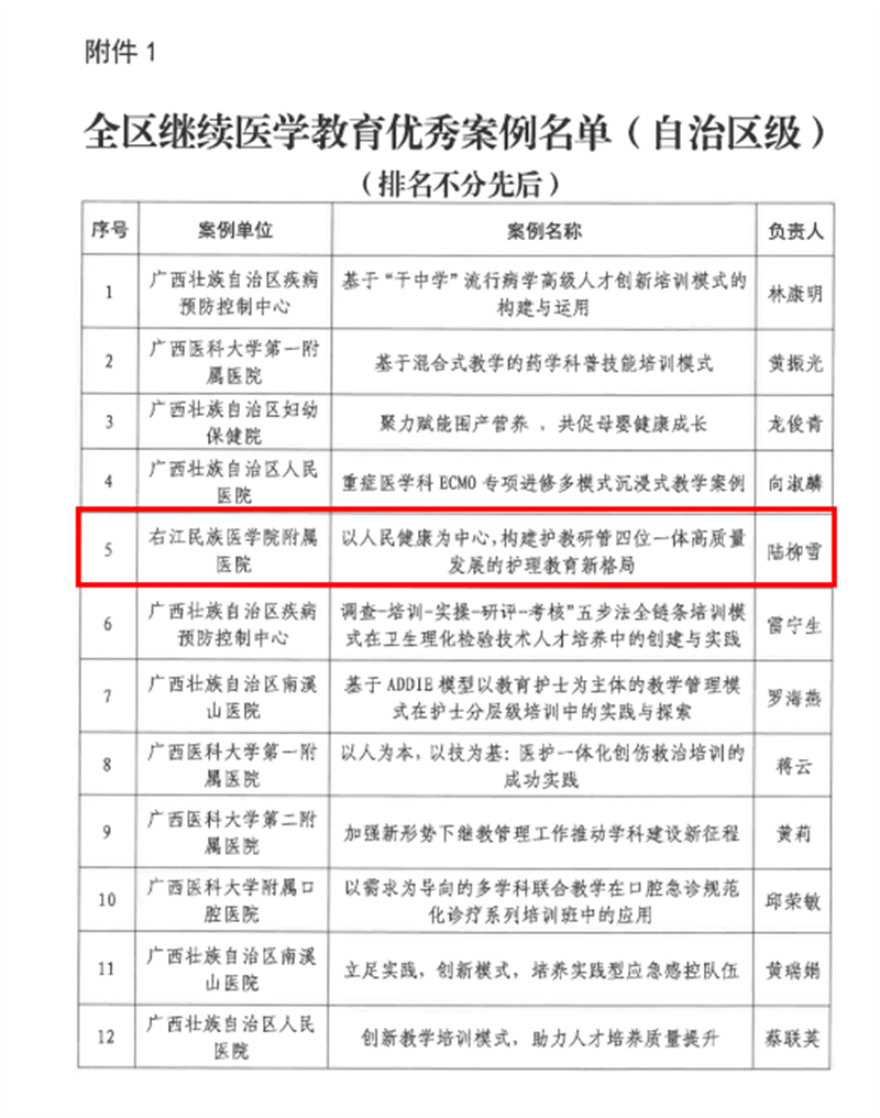 为贯彻落实国务院、自治区人民政府加快医学教育创新发展的部署精神,遴选具有代表性的继续医学教育典型案例,推进全区继续医学教育创新发展,广西继续医学教育委员会组织开展了全区继续医学教育优秀案例征集活动,在近日通报的评选结果中,右医附院护理部主任陆柳雪教授团队申报的《以人民健康为中心,构建护教研管四位一体高质量发展的护理教育新格局》案例榜上有名,获评广西继续医学教育优秀案例(自治区级)。